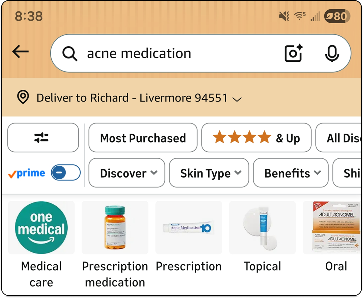 Amazon Health uses categories such as “Medical care” to surface the One Medical storefront and “Prescription medication” to surface relevant prescriptions.